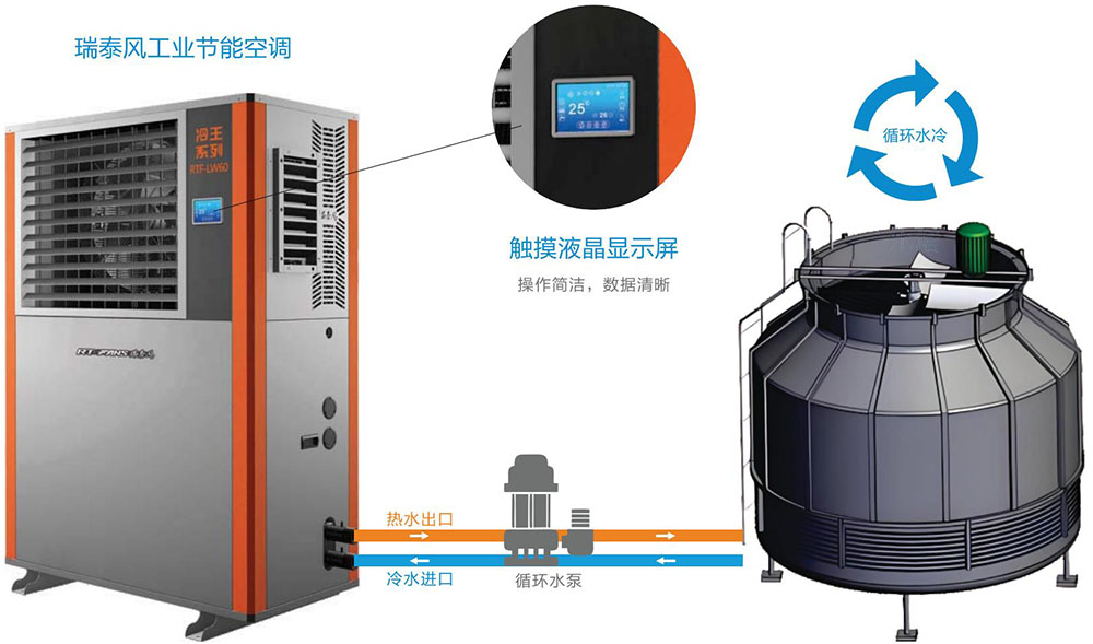 給冷媒降溫后的循環(huán)水會被水泵送回外機上部,結(jié)合水塔或蒸發(fā)水冷重新降溫,恢復(fù)常溫后再次進入內(nèi)機循環(huán)。這樣不斷循環(huán)往復(fù),能最大化發(fā)揮能效,讓制冷效率更高。